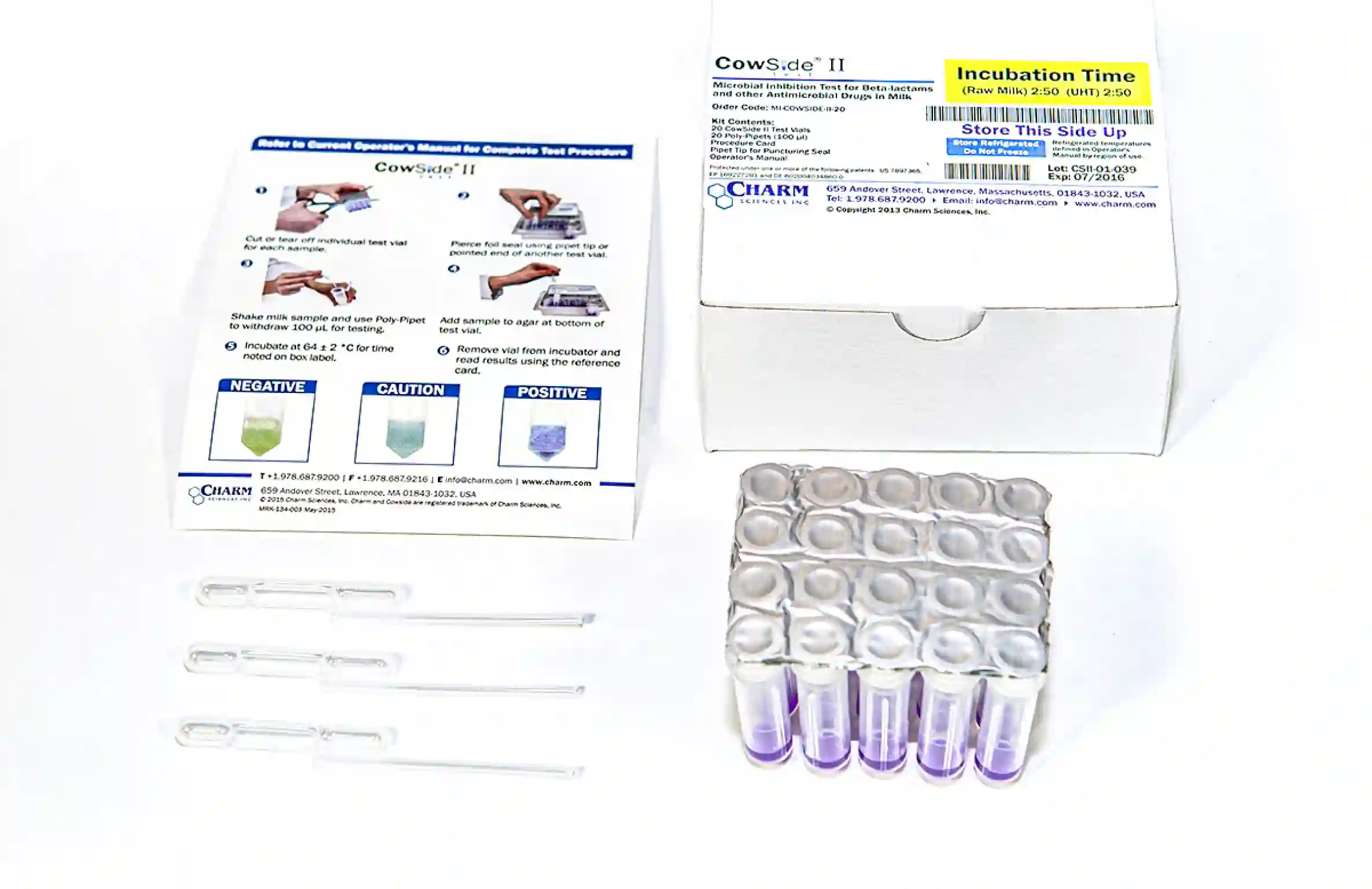 La technologie Charm a été adoptée dans le monde entier par l’industrie laitière pour réaliser des criblages des résidues dans le lait de façon rapide et précise. Charm CowSide II® est une méthode détectant la présence de composés antibiotiques dans le lait crû et ultra-pasteurisé. Ce test d'inhibition présente une sensibilité supérieure aux bêta-lactames, sulfonamides, aminoglycosides et surtout aux tétracyclines, ce qui en fait le test le plus proche des seuils réglementaires EU MRL. C'est un test simple, prêt à l'emploi et qui donne un résultat en 3h. C'est pour cette raison qu'il peut être utilisé en laboratoire et en ferme.